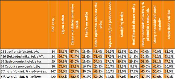 Tab.1: Nejčastější důvody volby učební úrovně vzdělání – vybrané skupiny oborů (v % odpovědí rozhodně ano + spíše ano)[1][2]