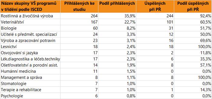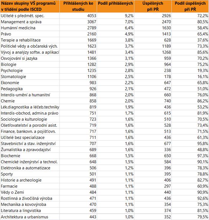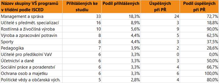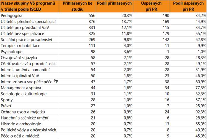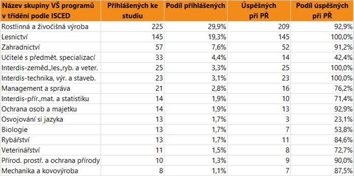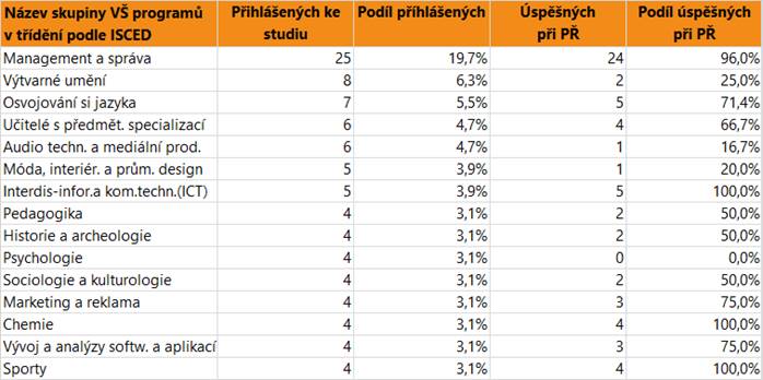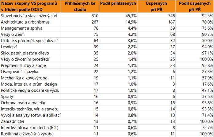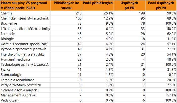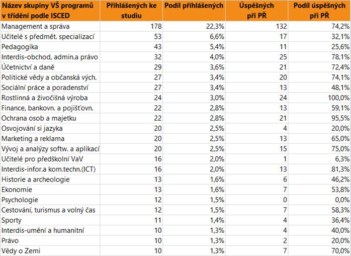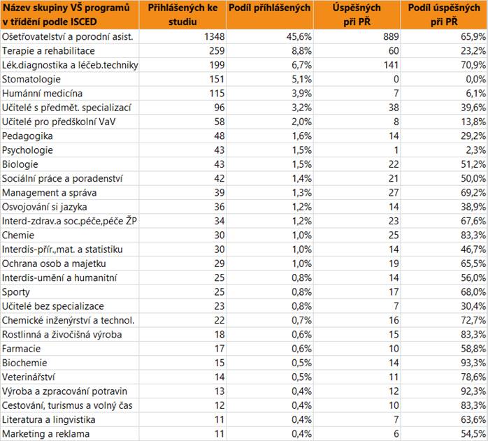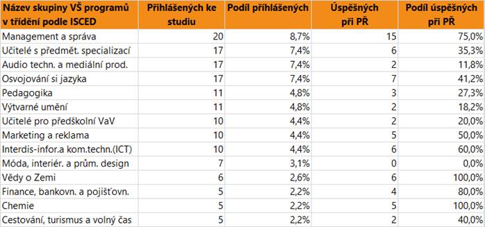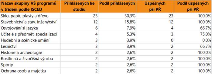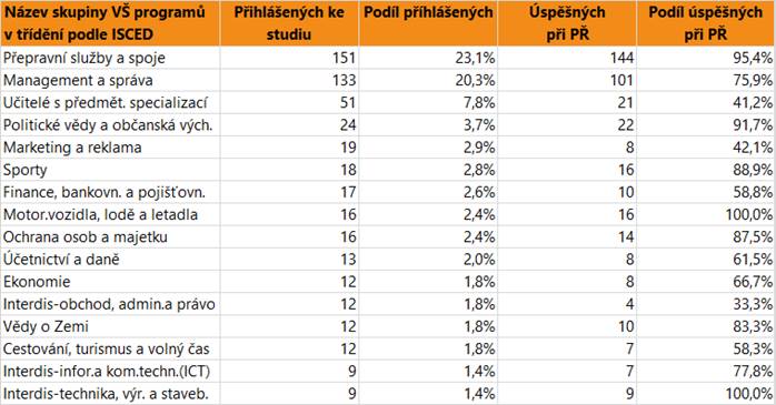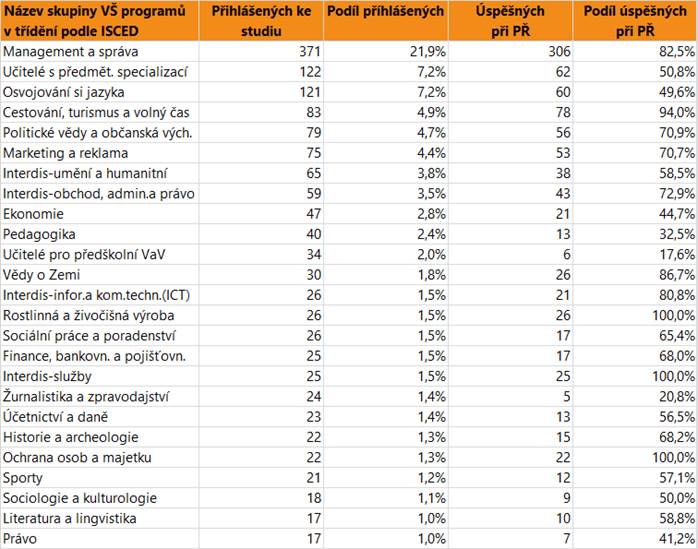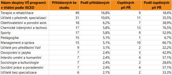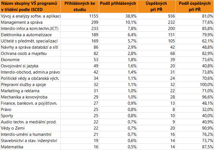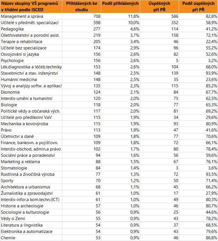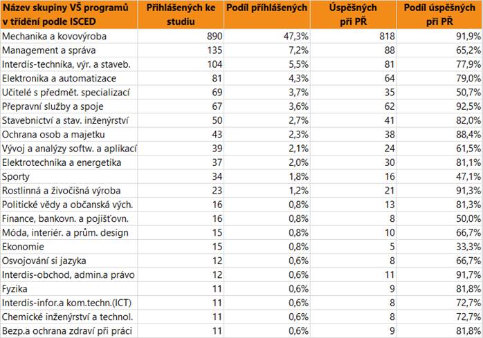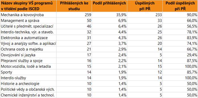 V dalším textu jsou uvedeny vždy údaje o zájmu a úspěšnosti absolventů dané skupině oborů SŠ jako celku, v tabulce jsou pak hodnoty přihlášených a úspěšných zájemců o vysokoškolské vzdělání pro skupiny VŠ programů, do kterých se hlásí větší počet či podíl absolventů. Jsou zahrnuti přihlášení do bakalářských i nenavazujících magisterských programů.