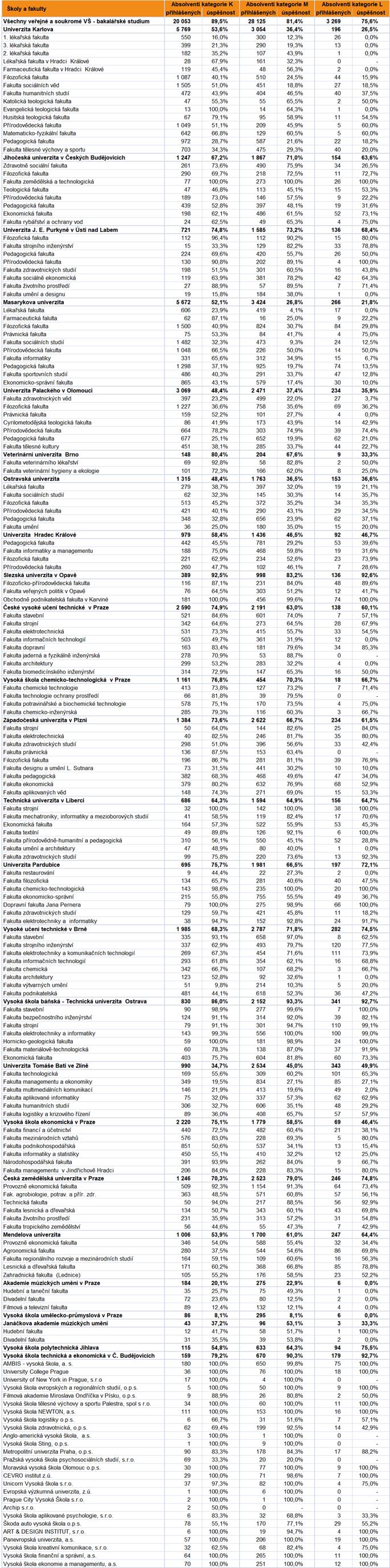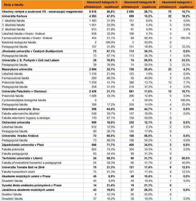 V následujících tabulkách uvádíme v rozčlenění podle kategorií vzdělání K, M a L počty uchazečů a jejich úspěšnost v přijímacím řízení na jednotlivých vysokých školách i jejich fakultách. Údaje jsou o absolventech, kteří maturovali v roce 2024.