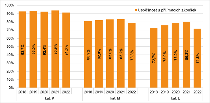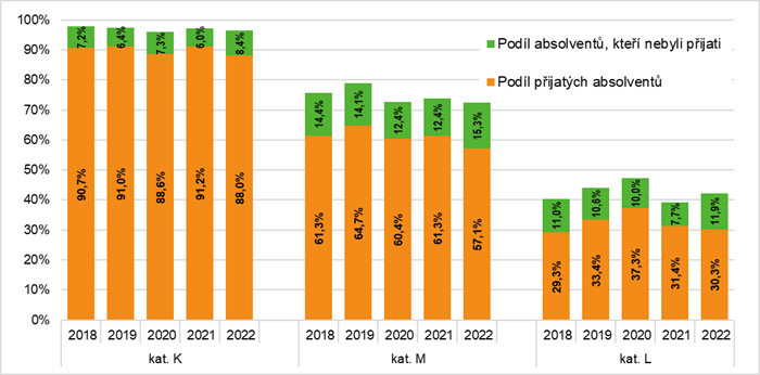 Z absolventů gymnaziálního vzdělávání, kteří se hlásí na vysoké školy téměř všichni, je podíl přijatých 88–91 %, u absolventů oborů kategorie M je to 57–62 % a u absolventů, kteří absolvovali v kategorie L (tj. dohromady L0 a L5), je podíl těch, kteří byli přijati k vysokoškolskému studiu 29–33 %.