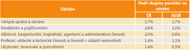 Největší část osob ze skupiny povolání Zákonodárci, nejvyšší státní úředníci a nejvyšší představitelé společností je v ČR zaměstnána v odvětví Veřejná správa a obrana. Druhým nejvýznamnějším zaměstnavatelem je pro tuto skupinu povolání odvětví Stavebnictví. Dalším významným zaměstnavatelem je pro tuto skupinu povolání odvětví Velkoobchod, maloobchod a opravy motorových vozidel, dále Profesní, vědecké a technické činnosti a činnosti v oblasti nemovitostí a také Peněžnictví a pojišťovnictví. Následující tabulka porovnává, jaká je distribuce zaměstnaných osob z této skupiny povolání do odvětví v ČR a v EU28.