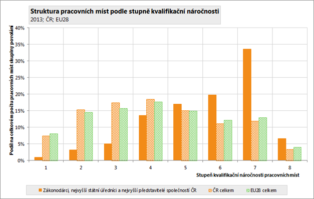 Kvalifikační náročnost pracovních míst je ukazatel, zahrnující v sobě nejen vzdělání potřebné pro dané pracovní místo, ale i další zapracování v podobě praxe. Čím vyšší stupeň, tím vyšší kvalifikační nároky jsou pro dané pracovní místo požadovány. Celková úroveň kvalifikační náročnosti (požadavků) pracovních míst obsazených osobami ze skupiny povolání Zákonodárci, nejvyšší státní úředníci a nejvyšší představitelé společností činila v roce 2013 v ČR 5,69 bodu (na osmistupňové škále). To je o 1,54 bodu více, než je kvalifikační náročnost všech pracovních míst v celé ČR. V EU28 činila v roce 2013 úroveň kvalifikačních požadavků pracovních míst obsazených osobami s touto skupinou povolání 5,77 bodu, byla tedy o 0,08 bodu vyšší, než kvalifikační náročnost pracovních míst obsazená těmito osobami v ČR. V porovnání se všemi pracovními místy v EU28 je kvalifikační náročnost pracovních míst obsazených osobami ze skupiny povolání Zákonodárci, nejvyšší státní úředníci a nejvyšší představitelé společností vyšší, než je kvalifikační náročnost pracovních míst v celé EU28 a to o 1,53 bodu.