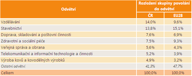 Vzhledem k uvedenému rozložení zaměstnaných osob do jednotlivých odvětví je v ČR odvětvová koncentrace této skupiny povolání v porovnání s ostatními skupinami povolání velmi nízká.