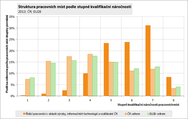 Kvalifikační náročnost pracovních míst je ukazatel, zahrnující v sobě nejen vzdělání potřebné pro dané pracovní místo, ale i další zapracování v podobě praxe. Čím vyšší stupeň, tím vyšší kvalifikační nároky jsou pro dané pracovní místo požadovány. Celková úroveň kvalifikační náročnosti (požadavků) pracovních míst obsazených osobami ze skupiny povolání Řídící pracovníci v oblasti výroby, informačních technologií a vzdělávání činila v roce 2013 v ČR 5,92 bodu (na osmistupňové škále). To je o 1,76 bodu více, než je kvalifikační náročnost všech pracovních míst v celé ČR. V EU28 činila v roce 2013 úroveň kvalifikačních požadavků pracovních míst obsazených osobami s touto skupinou povolání 5,91 bodu, byla tedy o 0,01 bodu nižší, než kvalifikační náročnost pracovních míst obsazená těmito osobami v ČR. V porovnání se všemi pracovními místy v EU28 je kvalifikační náročnost pracovních míst obsazených osobami ze skupiny povolání Řídící pracovníci v oblasti výroby, informačních technologií a vzdělávání vyšší, než je kvalifikační náročnost pracovních míst v celé EU28 a to o 1,67 bodu.