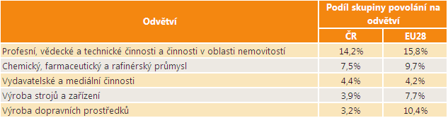 Největší část osob ze skupiny povolání Specialisté v oblasti vědy a techniky je v ČR zaměstnána v odvětví Profesní, vědecké a technické činnosti a činnosti v oblasti nemovitostí. Druhým nejvýznamnějším zaměstnavatelem je pro tuto skupinu povolání odvětví Stavebnictví. Dalším významným zaměstnavatelem je pro tuto skupinu povolání odvětví Výroba dopravních prostředků, dále Veřejná správa a obrana a také Výroba elektrických a optických přístrojů. Následující tabulka porovnává, jaká je distribuce zaměstnaných osob z této skupiny povolání do odvětví v ČR a v EU28.