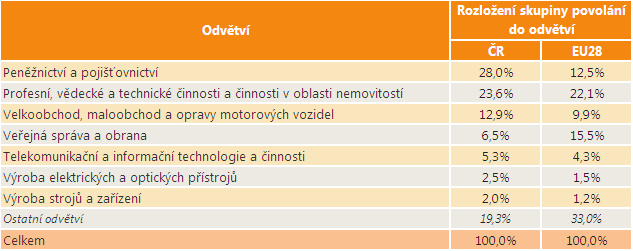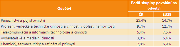 Odvětvová exkluzivita této skupiny je vysoká. Následující tabulka ukazuje ta odvětví, ve kterých má tato skupina povolání v ČR největší podíl na jejich celkovém počtu zaměstnaných. Pro porovnání je uveden i podíl této skupiny povolání na odvětvích v EU28.