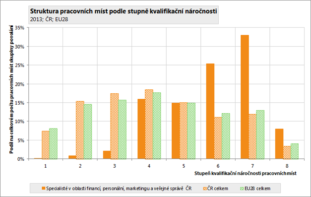 Kvalifikační náročnost pracovních míst je ukazatel, zahrnující v sobě nejen vzdělání potřebné pro dané pracovní místo, ale i další zapracování v podobě praxe. Čím vyšší stupeň, tím vyšší kvalifikační nároky jsou pro dané pracovní místo požadovány. Celková úroveň kvalifikační náročnosti (požadavků) pracovních míst obsazených osobami ze skupiny povolání Specialisté v oblasti financí, personální, marketingu a veřejné správě činila v roce 2013 v ČR 5,92 bodu (na osmistupňové škále). To je o 1,77 bodu více, než je kvalifikační náročnost všech pracovních míst v celé ČR. V EU28 činila v roce 2013 úroveň kvalifikačních požadavků pracovních míst obsazených osobami s touto skupinou povolání 5,9 bodu, byla tedy o 0,03 bodu nižší, než kvalifikační náročnost pracovních míst obsazená těmito osobami v ČR. V porovnání se všemi pracovními místy v EU28 je kvalifikační náročnost pracovních míst obsazených osobami ze skupiny povolání Specialisté v oblasti financí, personální, marketingu a veřejné správě vyšší, než je kvalifikační náročnost pracovních míst v celé EU28 a to o 1,65 bodu.