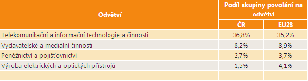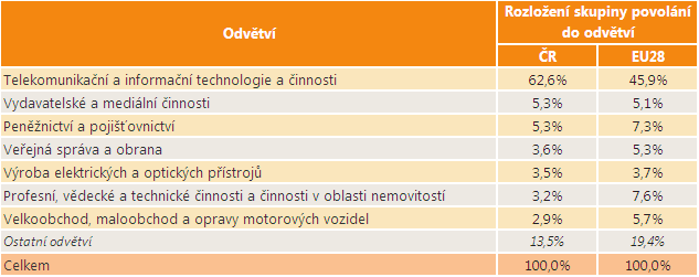 Největší část osob ze skupiny povolání Specialisté v oblasti informačních a komunikačních technologií je v ČR zaměstnána v odvětví Telekomunikační a informační technologie a činnosti. Druhým nejvýznamnějším zaměstnavatelem je pro tuto skupinu povolání odvětví Vydavatelské a mediální činnosti. Dalším významným zaměstnavatelem je pro tuto skupinu povolání odvětví Peněžnictví a pojišťovnictví, dále Veřejná správa a obrana a také Výroba elektrických a optických přístrojů. Následující tabulka porovnává, jaká je distribuce zaměstnaných osob z této skupiny povolání do odvětví v ČR a v EU28.