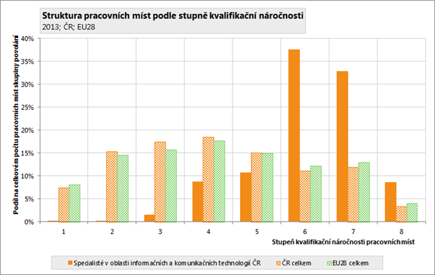 Kvalifikační náročnost pracovních míst je ukazatel, zahrnující v sobě nejen vzdělání potřebné pro dané pracovní místo, ale i další zapracování v podobě praxe. Čím vyšší stupeň, tím vyšší kvalifikační nároky jsou pro dané pracovní místo požadovány. Celková úroveň kvalifikační náročnosti (požadavků) pracovních míst obsazených osobami ze skupiny povolání Specialisté v oblasti informačních a komunikačních technologií činila v roce 2013 v ČR 6,17 bodu (na osmistupňové škále). To je o 2,01 bodu více, než je kvalifikační náročnost všech pracovních míst v celé ČR. V EU28 činila v roce 2013 úroveň kvalifikačních požadavků pracovních míst obsazených osobami s touto skupinou povolání 6,16 bodu, byla tedy o 0,01 bodu nižší, než kvalifikační náročnost pracovních míst obsazená těmito osobami v ČR. V porovnání se všemi pracovními místy v EU28 je kvalifikační náročnost pracovních míst obsazených osobami ze skupiny povolání Specialisté v oblasti informačních a komunikačních technologií vyšší, než je kvalifikační náročnost pracovních míst v celé EU28 a to o 1,91 bodu.