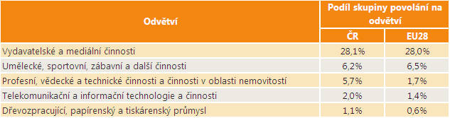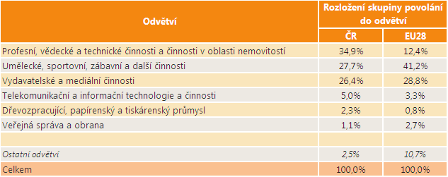 Největší část osob ze skupiny povolání Umělci, spisovatelé, novináři a jazykovědci je v ČR zaměstnána v odvětví Profesní, vědecké a technické činnosti a činnosti v oblasti nemovitostí. Druhým nejvýznamnějším zaměstnavatelem je pro tuto skupinu povolání odvětví Umělecké, sportovní, zábavní a další činnosti. Dalším významným zaměstnavatelem je pro tuto skupinu povolání odvětví Vydavatelské a mediální činnosti, dále Telekomunikační a informační technologie a činnosti a také Dřevozpracující, papírenský a tiskárenský průmysl. Následující tabulka porovnává, jaká je distribuce zaměstnaných osob z této skupiny povolání do odvětví v ČR a v EU28.