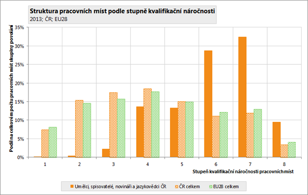 Kvalifikační náročnost pracovních míst je ukazatel, zahrnující v sobě nejen vzdělání potřebné pro dané pracovní místo, ale i další zapracování v podobě praxe. Čím vyšší stupeň, tím vyšší kvalifikační nároky jsou pro dané pracovní místo požadovány. Celková úroveň kvalifikační náročnosti (požadavků) pracovních míst obsazených osobami ze skupiny povolání Umělci, spisovatelé, novináři a jazykovědci činila v roce 2013 v ČR 6,03 bodu (na osmistupňové škále). To je o 1,87 bodu více, než je kvalifikační náročnost všech pracovních míst v celé ČR. V EU28 činila v roce 2013 úroveň kvalifikačních požadavků pracovních míst obsazených osobami s touto skupinou povolání 6,04 bodu, byla tedy o 0,01 bodu vyšší, než kvalifikační náročnost pracovních míst obsazená těmito osobami v ČR. V porovnání se všemi pracovními místy v EU28 je kvalifikační náročnost pracovních míst obsazených osobami ze skupiny povolání Umělci, spisovatelé, novináři a jazykovědci vyšší, než je kvalifikační náročnost pracovních míst v celé EU28 a to o 1,79 bodu.