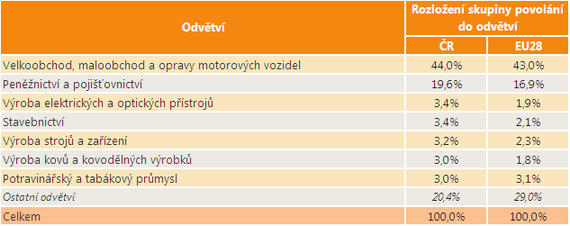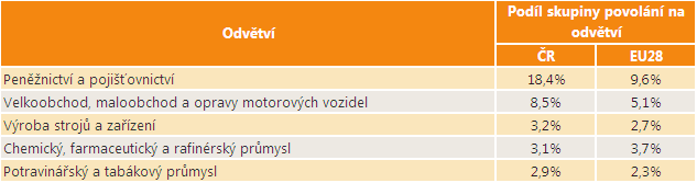 Odvětvová exkluzivita této skupiny je nadprůměrná. Následující tabulka ukazuje ta odvětví, ve kterých má tato skupina povolání v ČR největší podíl na jejich celkovém počtu zaměstnaných. Pro porovnání je uveden i podíl této skupiny povolání na odvětvích v EU28.