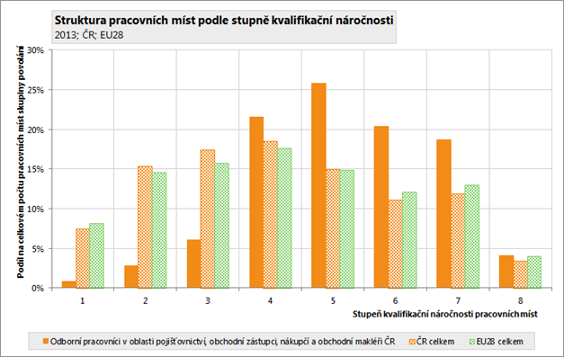 Kvalifikační náročnost pracovních míst je ukazatel, zahrnující v sobě nejen vzdělání potřebné pro dané pracovní místo, ale i další zapracování v podobě praxe. Čím vyšší stupeň, tím vyšší kvalifikační nároky jsou pro dané pracovní místo požadovány. Celková úroveň kvalifikační náročnosti (požadavků) pracovních míst obsazených osobami ze skupiny povolání Odborní pracovníci v oblasti pojišťovnictví, obchodní zástupci, nákupčí a obchodní makléři činila v roce 2013 v ČR 5,25 bodu (na osmistupňové škále). To je o 1,09 bodu více, než je kvalifikační náročnost všech pracovních míst v celé ČR. V EU28 činila v roce 2013 úroveň kvalifikačních požadavků pracovních míst obsazených osobami s touto skupinou povolání 5,26 bodu, byla tedy o 0,01 bodu vyšší, než kvalifikační náročnost pracovních míst obsazená těmito osobami v ČR. V porovnání se všemi pracovními místy v EU28 je kvalifikační náročnost pracovních míst obsazených osobami ze skupiny povolání Odborní pracovníci v oblasti pojišťovnictví, obchodní zástupci, nákupčí a obchodní makléři vyšší, než je kvalifikační náročnost pracovních míst v celé EU28 a to o 1,00 bodu.