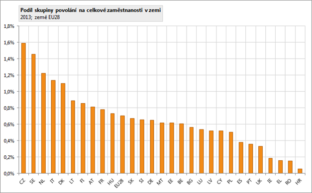 V EU28 bylo v roce 2013 v této skupině povolání zaměstnáno zhruba 1,5 milionu osob. V EU28 tato skupina povolání tvoří 0,7 % ze všech zaměstnaných, tedy o 0,9 procentních bodů méně, než je podíl této skupiny povolání na zaměstnaných v ČR.
