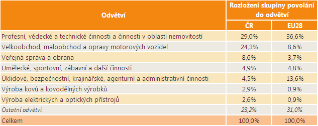 Největší část osob ze skupiny povolání Zprostředkovatelé služeb je v ČR zaměstnána v odvětví Profesní, vědecké a technické činnosti a činnosti v oblasti nemovitostí. Druhým nejvýznamnějším zaměstnavatelem je pro tuto skupinu povolání odvětví Velkoobchod, maloobchod a opravy motorových vozidel. Dalším významným zaměstnavatelem je pro tuto skupinu povolání odvětví Veřejná správa a obrana, dále Umělecké, sportovní, zábavní a další činnosti a také Úklidové, bezpečnostní, krajinářské, agenturní a administrativní činnosti. Následující tabulka porovnává, jaká je distribuce zaměstnaných osob z této skupiny povolání do odvětví v ČR a v EU28.