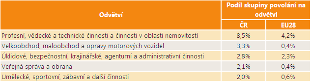Odvětvová exkluzivita této skupiny je nízká. Následující tabulka ukazuje ta odvětví, ve kterých má tato skupina povolání v ČR největší podíl na jejich celkovém počtu zaměstnaných. Pro porovnání je uveden i podíl této skupiny povolání na odvětvích v EU28.