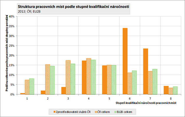 Kvalifikační náročnost pracovních míst je ukazatel, zahrnující v sobě nejen vzdělání potřebné pro dané pracovní místo, ale i další zapracování v podobě praxe. Čím vyšší stupeň, tím vyšší kvalifikační nároky jsou pro dané pracovní místo požadovány. Celková úroveň kvalifikační náročnosti (požadavků) pracovních míst obsazených osobami ze skupiny povolání Zprostředkovatelé služeb činila v roce 2013 v ČR 5,61 bodu (na osmistupňové škále). To je o 1,45 bodu více, než je kvalifikační náročnost všech pracovních míst v celé ČR. V EU28 činila v roce 2013 úroveň kvalifikačních požadavků pracovních míst obsazených osobami s touto skupinou povolání 5,66 bodu, byla tedy o 0,05 bodu vyšší, než kvalifikační náročnost pracovních míst obsazená těmito osobami v ČR. V porovnání se všemi pracovními místy v EU28 je kvalifikační náročnost pracovních míst obsazených osobami ze skupiny povolání Zprostředkovatelé služeb vyšší, než je kvalifikační náročnost pracovních míst v celé EU28 a to o 1,41 bodu.