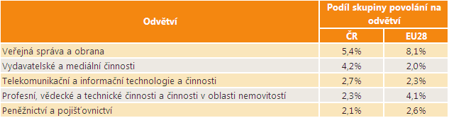 Odvětvová exkluzivita této skupiny je velmi nízká. Následující tabulka ukazuje ta odvětví, ve kterých má tato skupina povolání v ČR největší podíl na jejich celkovém počtu zaměstnaných. Pro porovnání je uveden i podíl této skupiny povolání na odvětvích v EU28.
