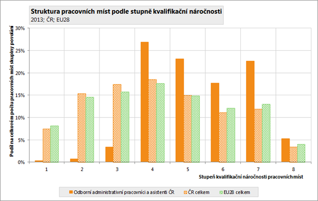 Kvalifikační náročnost pracovních míst je ukazatel, zahrnující v sobě nejen vzdělání potřebné pro dané pracovní místo, ale i další zapracování v podobě praxe. Čím vyšší stupeň, tím vyšší kvalifikační nároky jsou pro dané pracovní místo požadovány. Celková úroveň kvalifikační náročnosti (požadavků) pracovních míst obsazených osobami ze skupiny povolání Odborní administrativní pracovníci a asistenti činila v roce 2013 v ČR 5,42 bodu (na osmistupňové škále). To je o 1,26 bodu více, než je kvalifikační náročnost všech pracovních míst v celé ČR. V EU28 činila v roce 2013 úroveň kvalifikačních požadavků pracovních míst obsazených osobami s touto skupinou povolání 5,43 bodu, byla tedy o 0,01 bodu vyšší, než kvalifikační náročnost pracovních míst obsazená těmito osobami v ČR. V porovnání se všemi pracovními místy v EU28 je kvalifikační náročnost pracovních míst obsazených osobami ze skupiny povolání Odborní administrativní pracovníci a asistenti vyšší, než je kvalifikační náročnost pracovních míst v celé EU28 a to o 1,17 bodu.