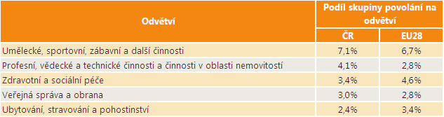 Odvětvová exkluzivita této skupiny je nízká. Následující tabulka ukazuje ta odvětví, ve kterých má tato skupina povolání v ČR největší podíl na jejich celkovém počtu zaměstnaných. Pro porovnání je uveden i podíl této skupiny povolání na odvětvích v EU28.