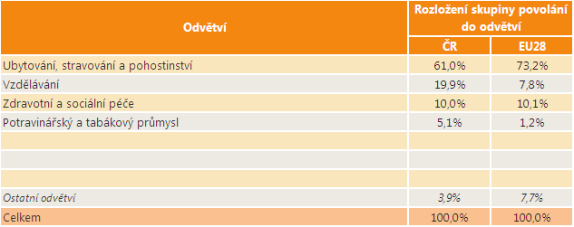 Odvětvová exkluzivita této skupiny je nadprůměrná. Následující tabulka ukazuje ta odvětví, ve kterých má tato skupina povolání v ČR největší podíl na jejich celkovém počtu zaměstnaných. Pro porovnání je uveden i podíl této skupiny povolání na odvětvích v EU28.