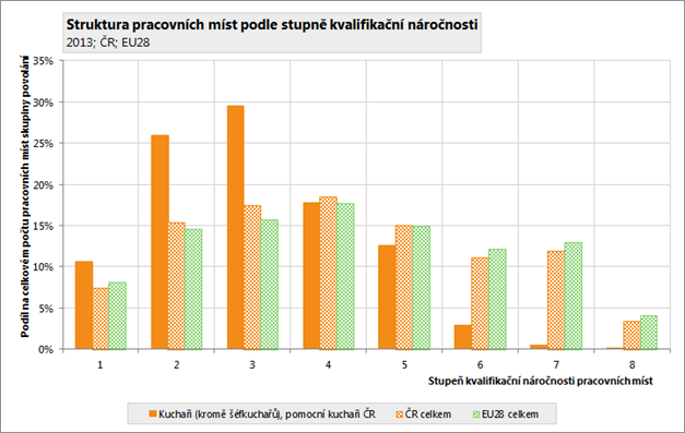 Kvalifikační náročnost pracovních míst je ukazatel, zahrnující v sobě nejen vzdělání potřebné pro dané pracovní místo, ale i další zapracování v podobě praxe. Čím vyšší stupeň, tím vyšší kvalifikační nároky jsou pro dané pracovní místo požadovány. Celková úroveň kvalifikační náročnosti (požadavků) pracovních míst obsazených osobami ze skupiny povolání Kuchaři (kromě šéfkuchařů), pomocní kuchaři činila v roce 2013 v ČR 3,07 bodu (na osmistupňové škále). To je o 1,09 bodu méně, než je kvalifikační náročnost všech pracovních míst v celé ČR. V EU28 činila v roce 2013 úroveň kvalifikačních požadavků pracovních míst obsazených osobami s touto skupinou povolání 3,11 bodu, byla tedy o 0,04 bodu vyšší, než kvalifikační náročnost pracovních míst obsazená těmito osobami v ČR. V porovnání se všemi pracovními místy v EU28 je kvalifikační náročnost pracovních míst obsazených osobami ze skupiny povolání Kuchaři (kromě šéfkuchařů), pomocní kuchaři nižší, než je kvalifikační náročnost pracovních míst v celé EU28 a to o 1,14 bodu.