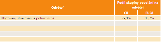 Největší část osob ze skupiny povolání Číšníci, servírky a barmani je v ČR zaměstnána v odvětví Ubytování, stravování a pohostinství. Dalšími významnějšími zaměstnavateli jsou pro tuto skupinu povolání odvětví Umělecké, sportovní, zábavní a další činnosti a Zdravotní a sociální péče. Následující tabulka porovnává, jaká je distribuce zaměstnaných osob z této skupiny povolání do odvětví v ČR a v EU28.
