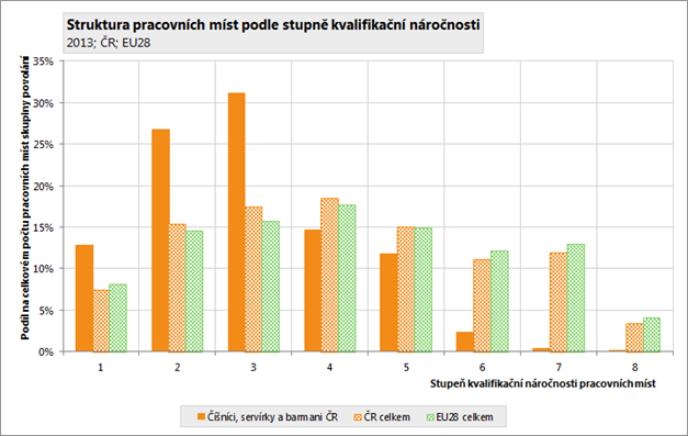 Kvalifikační náročnost pracovních míst je ukazatel, zahrnující v sobě nejen vzdělání potřebné pro dané pracovní místo, ale i další zapracování v podobě praxe. Čím vyšší stupeň, tím vyšší kvalifikační nároky jsou pro dané pracovní místo požadovány. Celková úroveň kvalifikační náročnosti (požadavků) pracovních míst obsazených osobami ze skupiny povolání Číšníci, servírky a barmani činila v roce 2013 v ČR 2,95 bodu (na osmistupňové škále). To je o 1,21 bodu méně, než je kvalifikační náročnost všech pracovních míst v celé ČR. V EU28 činila v roce 2013 úroveň kvalifikačních požadavků pracovních míst obsazených osobami s touto skupinou povolání 2,96 bodu, byla tedy o 0,01 bodu vyšší, než kvalifikační náročnost pracovních míst obsazená těmito osobami v ČR. V porovnání se všemi pracovními místy v EU28 je kvalifikační náročnost pracovních míst obsazených osobami ze skupiny povolání Číšníci, servírky a barmani nižší, než je kvalifikační náročnost pracovních míst v celé EU28 a to o 1,30 bodu.