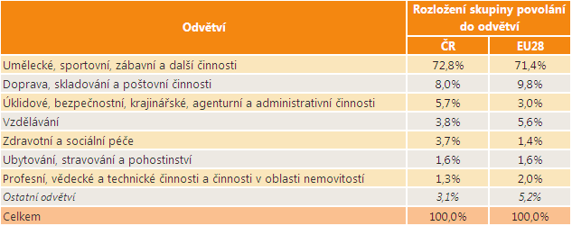 Největší část osob ze skupiny povolání Ostatní pracovníci v oblasti osobních služeb je v ČR zaměstnána v odvětví Umělecké, sportovní, zábavní a další činnosti. Druhým nejvýznamnějším zaměstnavatelem je pro tuto skupinu povolání odvětví Doprava, skladování a poštovní činnosti. Dalším významným zaměstnavatelem je pro tuto skupinu povolání odvětví Úklidové, bezpečnostní, krajinářské, agenturní a administrativní činnosti, dále Vzdělávání a také Zdravotní a sociální péče. Následující tabulka porovnává, jaká je distribuce zaměstnaných osob z této skupiny povolání do odvětví v ČR a v EU28.