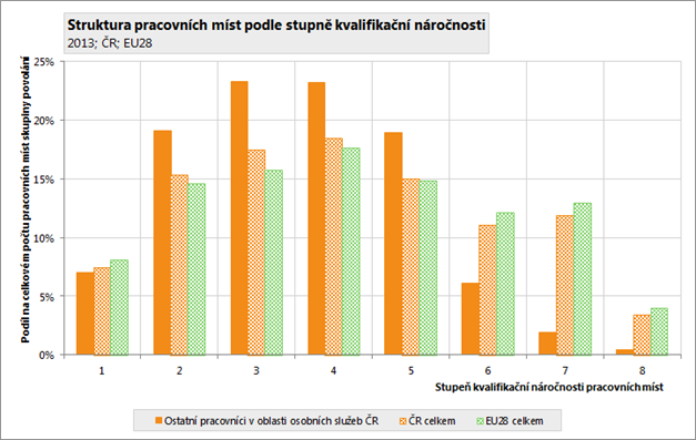 Kvalifikační náročnost pracovních míst je ukazatel, zahrnující v sobě nejen vzdělání potřebné pro dané pracovní místo, ale i další zapracování v podobě praxe. Čím vyšší stupeň, tím vyšší kvalifikační nároky jsou pro dané pracovní místo požadovány. Celková úroveň kvalifikační náročnosti (požadavků) pracovních míst obsazených osobami ze skupiny povolání Ostatní pracovníci v oblasti osobních služeb činila v roce 2013 v ČR 3,56 bodu (na osmistupňové škále). To je o 0,60 bodu méně, než je kvalifikační náročnost všech pracovních míst v celé ČR. V EU28 činila v roce 2013 úroveň kvalifikačních požadavků pracovních míst obsazených osobami s touto skupinou povolání 3,54 bodu, byla tedy o 0,02 bodu nižší, než kvalifikační náročnost pracovních míst obsazená těmito osobami v ČR. V porovnání se všemi pracovními místy v EU28 je kvalifikační náročnost pracovních míst obsazených osobami ze skupiny povolání Ostatní pracovníci v oblasti osobních služeb nižší, než je kvalifikační náročnost pracovních míst v celé EU28 a to o 0,71 bodu.