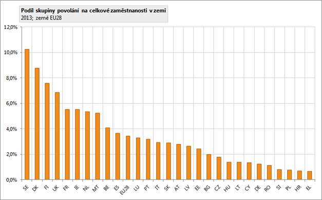 V EU28 bylo v roce 2013 v této skupině povolání zaměstnáno zhruba 7,4 milionu osob. V EU28 tato skupina povolání tvoří 3,5 % ze všech zaměstnaných, tedy o 1,7 procentních bodů více, než je podíl této skupiny povolání na zaměstnaných v ČR.