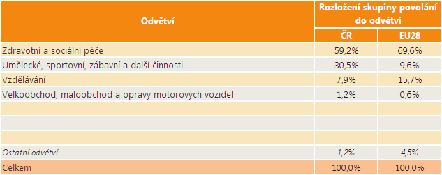 Největší část osob ze skupiny povolání Pracovníci osobní péče v oblasti vzdělávání, zdravotnictví a v příbuzných oblastech je v ČR zaměstnána v odvětví Zdravotní a sociální péče. Druhým nejvýznamnějším zaměstnavatelem je pro tuto skupinu povolání odvětví Umělecké, sportovní, zábavní a další činnosti. Dalším významným zaměstnavatelem je pro tuto skupinu povolání odvětví Vzdělávání a také Velkoobchod, maloobchod a opravy motorových vozidel. Následující tabulka porovnává, jaká je distribuce zaměstnaných osob z této skupiny povolání do odvětví v ČR a v EU28.