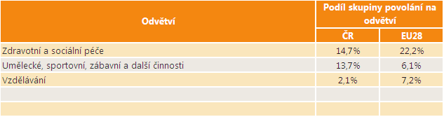 Odvětvová exkluzivita této skupiny je průměrná. Následující tabulka ukazuje ta odvětví, ve kterých má tato skupina povolání v ČR největší podíl na jejich celkovém počtu zaměstnaných. Pro porovnání je uveden i podíl této skupiny povolání na odvětvích v EU28.