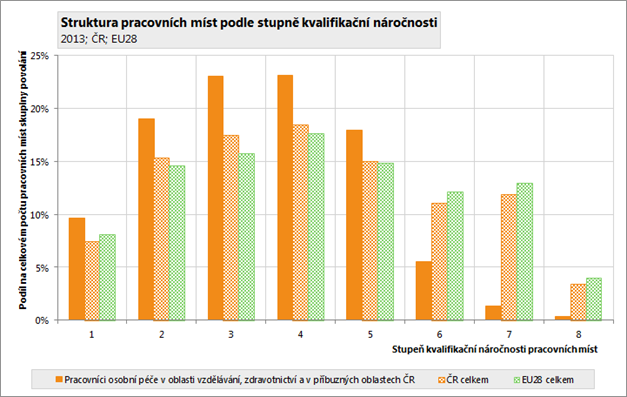 Kvalifikační náročnost pracovních míst je ukazatel, zahrnující v sobě nejen vzdělání potřebné pro dané pracovní místo, ale i další zapracování v podobě praxe. Čím vyšší stupeň, tím vyšší kvalifikační nároky jsou pro dané pracovní místo požadovány. Celková úroveň kvalifikační náročnosti (požadavků) pracovních míst obsazených osobami ze skupiny povolání Pracovníci osobní péče v oblasti vzdělávání, zdravotnictví a v příbuzných oblastech činila v roce 2013 v ČR 3,44 bodu (na osmistupňové škále). To je o 0,72 bodu méně, než je kvalifikační náročnost všech pracovních míst v celé ČR. V EU28 činila v roce 2013 úroveň kvalifikačních požadavků pracovních míst obsazených osobami s touto skupinou povolání 3,54 bodu, byla tedy o 0,10 bodu vyšší, než kvalifikační náročnost pracovních míst obsazená těmito osobami v ČR. V porovnání se všemi pracovními místy v EU28 je kvalifikační náročnost pracovních míst obsazených osobami ze skupiny povolání Pracovníci osobní péče v oblasti vzdělávání, zdravotnictví a v příbuzných oblastech nižší, než je kvalifikační náročnost pracovních míst v celé EU28 a to o 0,71 bodu.