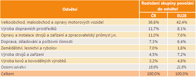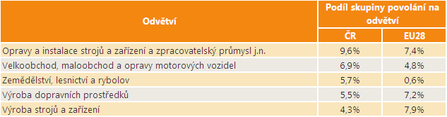 Odvětvová exkluzivita této skupiny je průměrná. Následující tabulka ukazuje ta odvětví, ve kterých má tato skupina povolání v ČR největší podíl na jejich celkovém počtu zaměstnaných. Pro porovnání je uveden i podíl této skupiny povolání na odvětvích v EU28.