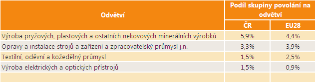 Odvětvová exkluzivita této skupiny je velmi nízká. Následující tabulka ukazuje ta odvětví, ve kterých má tato skupina povolání v ČR největší podíl na jejich celkovém počtu zaměstnaných. Pro porovnání je uveden i podíl této skupiny povolání na odvětvích v EU28.