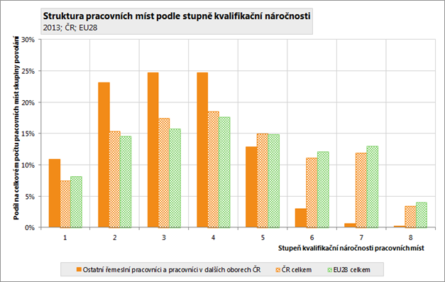 Kvalifikační náročnost pracovních míst je ukazatel, zahrnující v sobě nejen vzdělání potřebné pro dané pracovní místo, ale i další zapracování v podobě praxe. Čím vyšší stupeň, tím vyšší kvalifikační nároky jsou pro dané pracovní místo požadovány. Celková úroveň kvalifikační náročnosti (požadavků) pracovních míst obsazených osobami ze skupiny povolání Ostatní řemeslní pracovníci a pracovníci v dalších oborech činila v roce 2013 v ČR 3,18 bodu (na osmistupňové škále). To je o 0,98 bodu méně, než je kvalifikační náročnost všech pracovních míst v celé ČR. V EU28 činila v roce 2013 úroveň kvalifikačních požadavků pracovních míst obsazených osobami s touto skupinou povolání 3,19 bodu, byla tedy o 0,01 bodu vyšší, než kvalifikační náročnost pracovních míst obsazená těmito osobami v ČR. V porovnání se všemi pracovními místy v EU28 je kvalifikační náročnost pracovních míst obsazených osobami ze skupiny povolání Ostatní řemeslní pracovníci a pracovníci v dalších oborech nižší, než je kvalifikační náročnost pracovních míst v celé EU28 a to o 1,07 bodu.