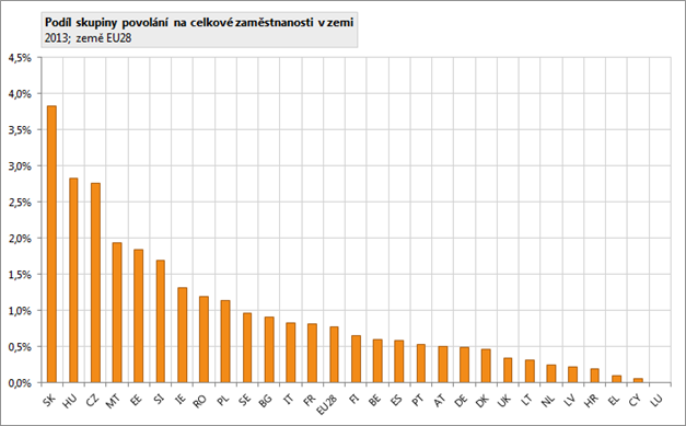 V EU28 bylo v roce 2013 v této skupině povolání zaměstnáno zhruba 1,7 milionu osob. V EU28 tato skupina povolání tvoří 0,8 % ze všech zaměstnaných, tedy o 2,0 procentních bodů méně, než je podíl této skupiny povolání na zaměstnaných v ČR.