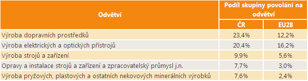 Odvětvová exkluzivita této skupiny je velmi vysoká. Následující tabulka ukazuje ta odvětví, ve kterých má tato skupina povolání v ČR největší podíl na jejich celkovém počtu zaměstnaných. Pro porovnání je uveden i podíl této skupiny povolání na odvětvích v EU28.