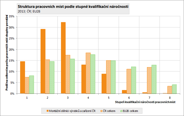 Kvalifikační náročnost pracovních míst je ukazatel, zahrnující v sobě nejen vzdělání potřebné pro dané pracovní místo, ale i další zapracování v podobě praxe. Čím vyšší stupeň, tím vyšší kvalifikační nároky jsou pro dané pracovní místo požadovány. Celková úroveň kvalifikační náročnosti (požadavků) pracovních míst obsazených osobami ze skupiny povolání Montážní dělníci výrobků a zařízení činila v roce 2013 v ČR 2,80 bodu (na osmistupňové škále). To je o 1,36 bodu méně, než je kvalifikační náročnost všech pracovních míst v celé ČR. V EU28 činila v roce 2013 úroveň kvalifikačních požadavků pracovních míst obsazených osobami s touto skupinou povolání 2,81 bodu, byla tedy o 0,01 bodu vyšší, než kvalifikační náročnost pracovních míst obsazená těmito osobami v ČR. V porovnání se všemi pracovními místy v EU28 je kvalifikační náročnost pracovních míst obsazených osobami ze skupiny povolání Montážní dělníci výrobků a zařízení nižší, než je kvalifikační náročnost pracovních míst v celé EU28 a to o 1,44 bodu.