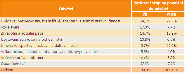 Největší část osob ze skupiny povolání Uklízeči a pomocníci je v ČR zaměstnána v odvětví Úklidové, bezpečnostní, krajinářské, agenturní a administrativní činnosti. Druhým nejvýznamnějším zaměstnavatelem je pro tuto skupinu povolání odvětví Vzdělávání. Dalším významným zaměstnavatelem je pro tuto skupinu povolání odvětví Zdravotní a sociální péče, dále Ubytování, stravování a pohostinství a také Umělecké, sportovní, zábavní a další činnosti. Následující tabulka porovnává, jaká je distribuce zaměstnaných osob z této skupiny povolání do odvětví v ČR a v EU28.