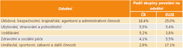 Odvětvová exkluzivita této skupiny je nadprůměrná. Následující tabulka ukazuje ta odvětví, ve kterých má tato skupina povolání v ČR největší podíl na jejich celkovém počtu zaměstnaných. Pro porovnání je uveden i podíl této skupiny povolání na odvětvích v EU28.