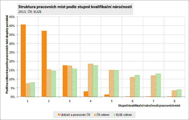 Kvalifikační náročnost pracovních míst je ukazatel, zahrnující v sobě nejen vzdělání potřebné pro dané pracovní místo, ale i další zapracování v podobě praxe. Čím vyšší stupeň, tím vyšší kvalifikační nároky jsou pro dané pracovní místo požadovány. Celková úroveň kvalifikační náročnosti (požadavků) pracovních míst obsazených osobami ze skupiny povolání Uklízeči a pomocníci činila v roce 2013 v ČR 1,88 bodu (na osmistupňové škále). To je o 2,28 bodu méně, než je kvalifikační náročnost všech pracovních míst v celé ČR. V EU28 činila v roce 2013 úroveň kvalifikačních požadavků pracovních míst obsazených osobami s touto skupinou povolání 1,87 bodu, byla tedy o 0,01 bodu nižší, než kvalifikační náročnost pracovních míst obsazená těmito osobami v ČR. V porovnání se všemi pracovními místy v EU28 je kvalifikační náročnost pracovních míst obsazených osobami ze skupiny povolání Uklízeči a pomocníci nižší, než je kvalifikační náročnost pracovních míst v celé EU28 a to o 2,37 bodu.
