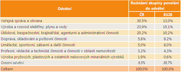 Vzhledem k uvedenému rozložení zaměstnaných osob do jednotlivých odvětví je v ČR odvětvová koncentrace této skupiny povolání v porovnání s ostatními skupinami povolání podprůměrná.