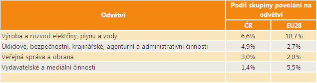 Odvětvová exkluzivita této skupiny je velmi nízká. Následující tabulka ukazuje ta odvětví, ve kterých má tato skupina povolání v ČR největší podíl na jejich celkovém počtu zaměstnaných. Pro porovnání je uveden i podíl této skupiny povolání na odvětvích v EU28.