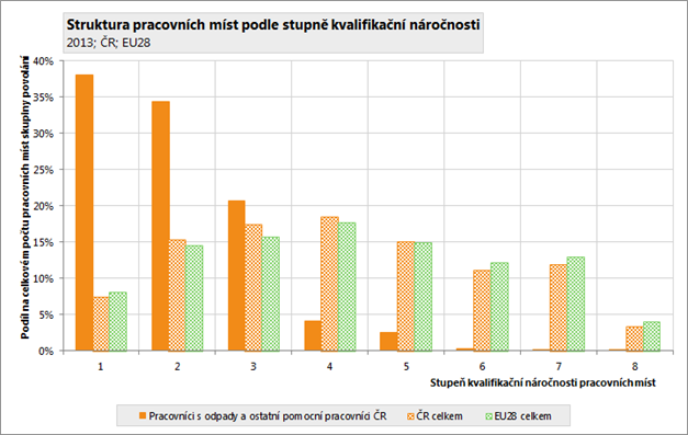 Kvalifikační náročnost pracovních míst je ukazatel, zahrnující v sobě nejen vzdělání potřebné pro dané pracovní místo, ale i další zapracování v podobě praxe. Čím vyšší stupeň, tím vyšší kvalifikační nároky jsou pro dané pracovní místo požadovány. Celková úroveň kvalifikační náročnosti (požadavků) pracovních míst obsazených osobami ze skupiny povolání Pracovníci s odpady a ostatní pomocní pracovníci činila v roce 2013 v ČR 2,00 bodu (na osmistupňové škále). To je o 2,16 bodu méně, než je kvalifikační náročnost všech pracovních míst v celé ČR. V EU28 činila v roce 2013 úroveň kvalifikačních požadavků pracovních míst obsazených osobami s touto skupinou povolání 2,01 bodu, byla tedy o 0,01 bodu vyšší, než kvalifikační náročnost pracovních míst obsazená těmito osobami v ČR. V porovnání se všemi pracovními místy v EU28 je kvalifikační náročnost pracovních míst obsazených osobami ze skupiny povolání Pracovníci s odpady a ostatní pomocní pracovníci nižší, než je kvalifikační náročnost pracovních míst v celé EU28 a to o 2,24 bodu.