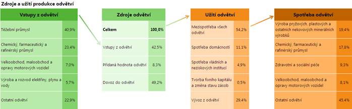 Následující schéma ukazuje, jaká je struktura zdrojů a užití v tomto odvětví. Na jedné straně jde o zdroje využité v odvětví - jedná se buď o spotřebované vstupy z jiných odvětví ekonomiky ČR (nebo ze stejného odvětví, avšak od jiných ekonomických subjektů), případně o vlastní výrobu (přidaná hodnota odvětví) nebo o vstupy ze zahraničí (dovoz). Druhá část schématu potom naopak ukazuje, kde jsou výstupy (produkty a služby) tohoto odvětví využívány. Výstupy z tohoto odvětví mohou sloužit buď jako vstup (zdroje) pro jiná odvětví, nebo mohou být spotřebovány (koupeny) domácnostmi či vládou nebo neziskovými institucemi. Další možností je, že výstupy tohoto odvětví poslouží pro tvorbu fixního kapitálu či zůstanou uloženy ve formě zásob. Poslední možností je, že výstupy tohoto odvětví budou spotřebovány v cizině (vývoz).