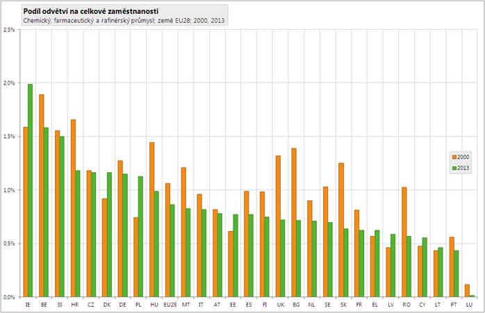 Nárůst produktivity práce, který byl v České republice v odvětví Chemický, farmaceutický a rafinérský průmysl nižší, než růst celkové produkce, způsobil mezi roky 2000-2014 zvýšení počtu zaměstnaných osob. Od roku 2000 se jejich počet zvýšil o necelých 6 tisíc, tedy zhruba o 9,9 %. V roce 2014 bylo v tomto odvětví v ČR zaměstnáno více než 61 tisíc osob. Podíl odvětví na celkové zaměstnanosti se v ČR mezi roky 2000-2014 zvýšil z 1,2 % na 1,3 %. V porovnání s podílem tohoto odvětví na celkové zaměstnanosti vůči EU28 je v ČR podíl odvětví Chemický, farmaceutický a rafinérský průmysl vyšší, neboť v EU28 má toto odvětví na celkové zaměstnanosti podíl 0,9 %. Následující graf porovnává podíl tohoto odvětví na celkové zaměstnanosti v jednotlivých zemích EU28.
