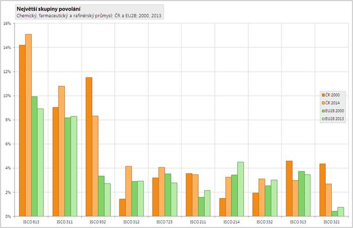 V odvětví Chemický, farmaceutický a rafinérský průmysl byly v ČR v roce 2014 tři skupiny povolání, které měly na celkovém počtu zaměstnaných v tomto odvětví podíl alespoň 5 %. Největší skupinou povolání je Obsluha strojů a zařízení pro chemickou výrobu a na výrobu fotografických materiálů (ISCO 813), která má na zaměstnaných osobách v tomto odvětví podíl zhruba 15 %. Koncentrace povolání je v tomto odvětví velmi nízká. Porovnání podílu největších skupin povolání v tomto odvětví v ČR a v EU28 ukazuje následující graf.