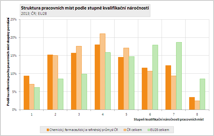 Kvalifikační náročnost pracovních míst je ukazatel, zahrnující v sobě nejen vzdělání potřebné pro dané pracovní místo, ale i další zapracování v podobě praxe. Čím vyšší stupeň, tím vyšší kvalifikační nároky jsou pro dané pracovní místo požadovány. Celková úroveň kvalifikační náročnosti (požadavků) pracovních míst v odvětví Chemický, farmaceutický a rafinérský průmysl činila v roce 2013 v ČR 4,14 bodu (na osmistupňové škále). To je o 0,07 bodu více, než je kvalifikační náročnost všech pracovních míst v celé ČR. V EU28 činila v roce 2013 úroveň kvalifikačních požadavků pracovních míst v tomto odvětví 3,64 bodu, byla tedy o 0,50 bodu nižší, než kvalifikační náročnost pracovních míst v tomto odvětví v ČR. V porovnání se všemi pracovními místy v EU28 je kvalifikační náročnost pracovních míst odvětví Chemický, farmaceutický a rafinérský průmysl nižší, než je kvalifikační náročnost pracovních míst v celé EU28 a to o 1,31 bodu.